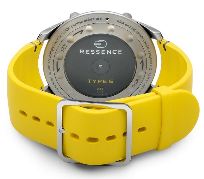 Il movimento si basa sull’ETA 2824 ed è dotato di un movimento automatico ROCS 5 che combina un modulo di complicazione brevettato (composto da un totale di 142 parti correlate) denominato Ressence Orbital Convex System (ROCS) che è stato ereditato dalla serie Type 1 (frequenza di 4 Hz, riserva di carica di circa 36 ore). Poiché non esiste una corona tradizionale, l’impostazione dell’ora e la carica possono essere eseguite ruotando il fondello. Questo è ciò che il marchio chiama Ressence Compression Lock System (RCLS)! Internamente, il modulo ROCS e il disco rotante del quadrante sono interbloccati applicando un sistema proprietario di trasmissione magnetica che applica il principio dei magneti. Nel frattempo, il cinturino in gomma premium di colore giallo è dotato di una fibbia Ardiyon realizzata in titanio grado 5, la stessa della cassa.