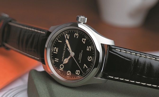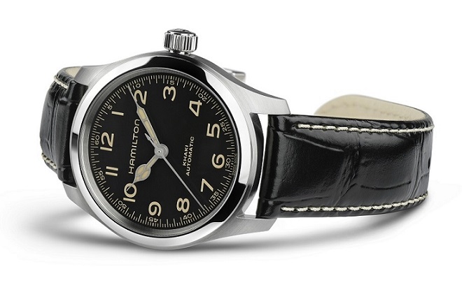 Il movimento è dotato del calibro automatico H-10 con una riserva di carica di 80 ore, identico alla precedente versione da 42 mm. Il movimento può essere apprezzato attraverso il fondello trasparente e il rotore scheletrato con inciso il logo Hamilton attira l’attenzione. E il cinturino ha firmato un cinturino in pelle di vacchetta nera con cuciture bianche.