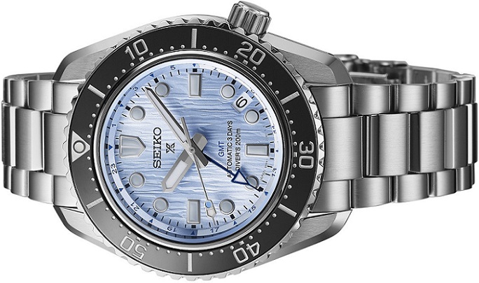 Un’altra novità è la versione GMT Save the Ocean Limited Edition, che quest’anno segna il 110° anniversario dell’orologeria Seiko. Le specifiche sono quasi le stesse dei modelli normali (SPB381J1, SPB383J1) introdotti in precedenza, ad eccezione del quadrante. Per la lunetta girevole unidirezionale è stato utilizzato un inserto in ceramica nera. Il motivo orizzontale irregolare applicato al quadrante è il motivo glaciale che è stato visto anche nell’edizione limitata Save the Ocean (SPB299J1) rilasciata lo scorso anno. Letteralmente un motivo ispirato ai ghiacciai, non è semplicemente stampato, ma realizzato attraverso un processo complesso che unisce migliaia di pezzi e li pressa in una pressa ad alta pressione. La nuova versione GMT è disponibile in un colore blu ghiaccio per una sensazione molto più glaciale. Nel frattempo, il quadrante con motivo a ghiacciaio ricorda anche il rapporto speciale di Seiko con Naomi Uemura, una leggendaria esploratrice giapponese che riuscì ad attraversare da sola il Polo Nord, una strada di 12.500 km dalla Groenlandia all’Alaska dal 1974 al 1976.